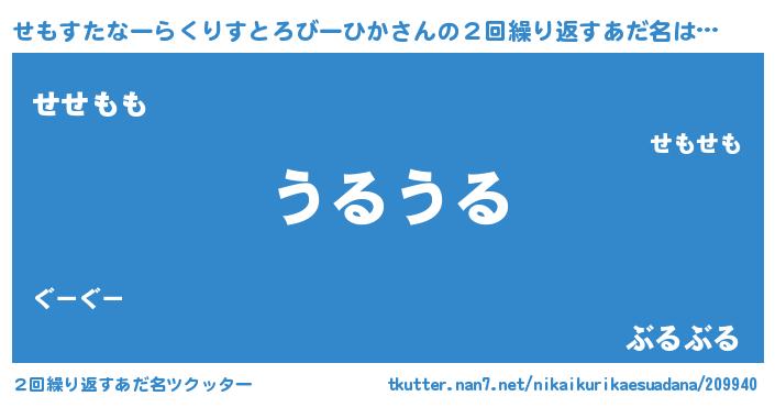 | 欧米人風あだ名 | 『ウサインせもすたなーらくりすとろびーひか』 |