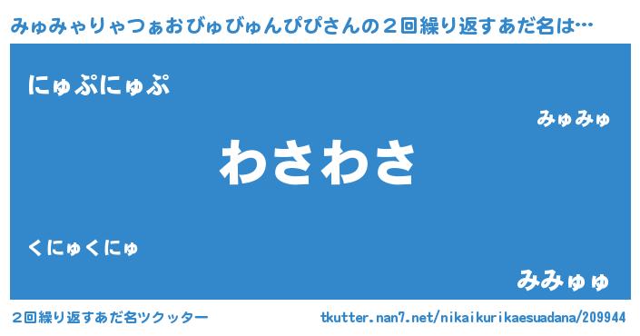 | 欧米人風あだ名 | 『アンジェラ・みゅみゃりゃつぁおびゅびゅんぴぴ』 |