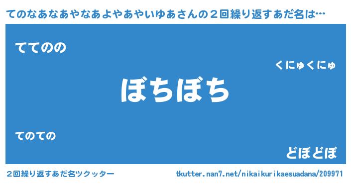 | 女子向けラノベタイトル風あだ名 | 『死神てのなあなあやなあよやあやいゆあの再婚』 |