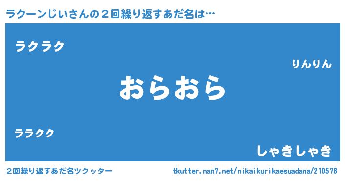 | 女子向けラノベタイトル風あだ名 | 『ラクーンじいの卵を拾いまして』 |