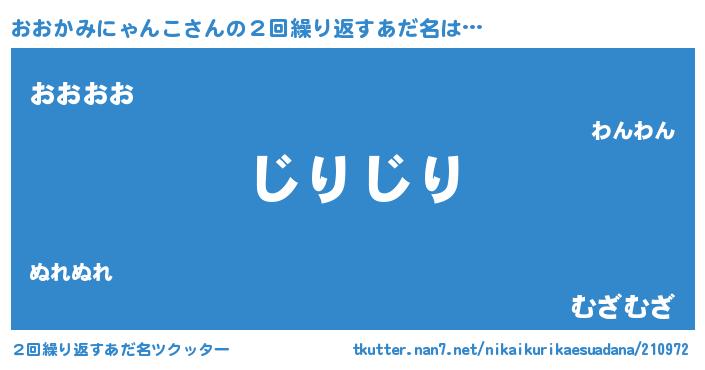 | 男性向けラノベタイトル風あだ名 | 『この素晴らしい世界におおかみにゃんこを!』 |