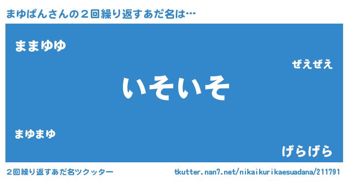 | 男性向けラノベタイトル風あだ名 | 『ダンジョンにまゆぱんを求めるのは間違っているだろうか』 |
