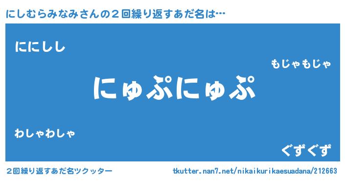 | ポケモン風あだ名 | 『ヒニシムラミナミ』『ニシムダネ』 |
