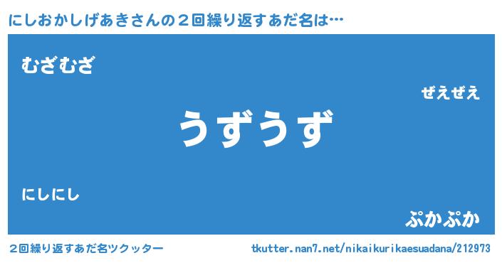 | 欧米人風あだ名 | 『ウサインにしおかしげあき』 |