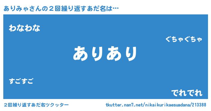 | 意味不明あだ名 | 『ペロリンありみゃ』『ニラ科ありみゃ属』 |