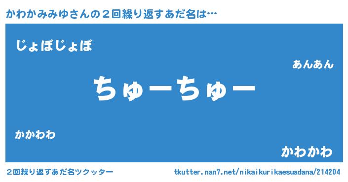| 欧米人風あだ名 | 『かわかみみゆ・ステッグマイヤー』 |