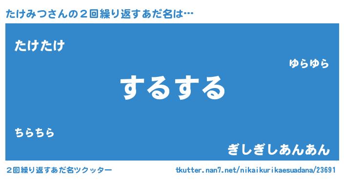 | 男性向けラノベタイトル風あだ名 | 『この素晴らしい世界にたけみつを!』 |