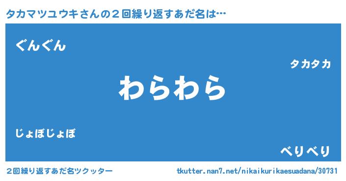 | 男性向けラノベタイトル風あだ名 | 『タカマツユウキ~年齢イコール彼女いない歴の魔法使い~』 |