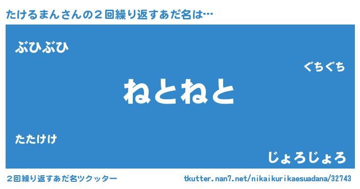 | 男性向けラノベタイトル風あだ名 | 『たけるまんに滅ぼされるだけの簡単なお仕事です』 |