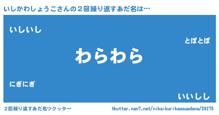 | 男性向けラノベタイトル風あだ名 | 『いしかわしょうこ~年齢イコール彼女いない歴の魔法使い~』 |