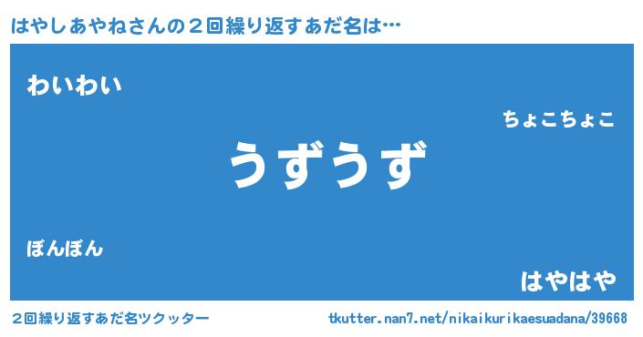 | 欧米人風あだ名 | 『ウサインはやしあやね』 |