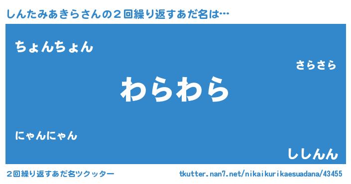 | 男性向けラノベタイトル風あだ名 | 『しんたみあきら~年齢イコール彼女いない歴の魔法使い~』 |