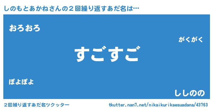 | 意味不明あだ名 | 『住所不定無職しのもとあかね(91歳)』 |