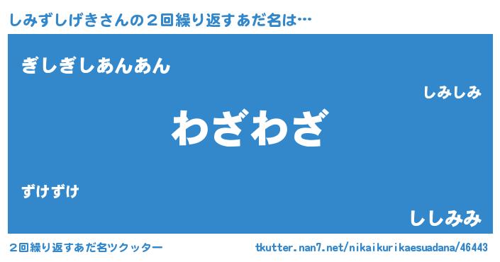 | 男性向けラノベタイトル風あだ名 | 『しみずしげき~年齢イコール彼女いない歴の魔法使い~』 |