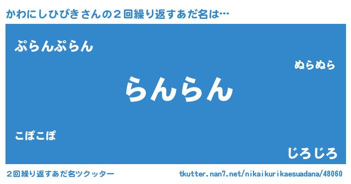 | ヘコむあだ名 | 『かわぷりん』『かわにしひびき(爆)』 |