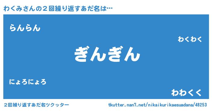 | 男性向けラノベタイトル風あだ名 | 『わくみという概念が存在しない退屈な世界 』 |