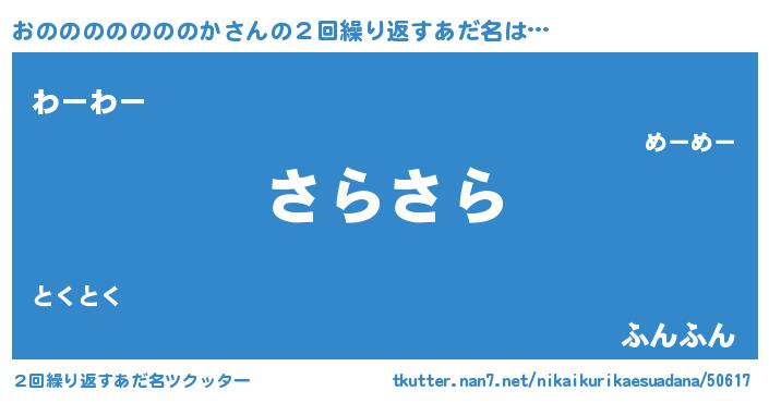 | 男性向けラノベタイトル風あだ名 | 『魔弾の王とおのののののののか』 |