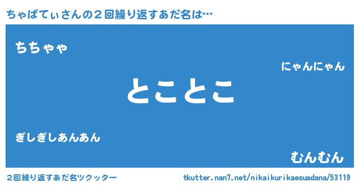 | 男性向けラノベタイトル風あだ名 | 『うちのちゃぱてぃが世界を掌握している!』 |