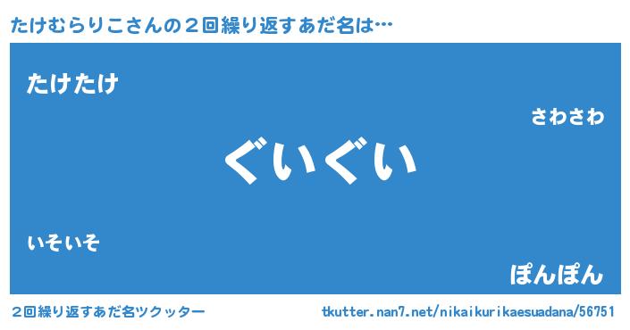 | ヘコむあだ名 | 『たけむらりこ(笑)』『たけにー』 |