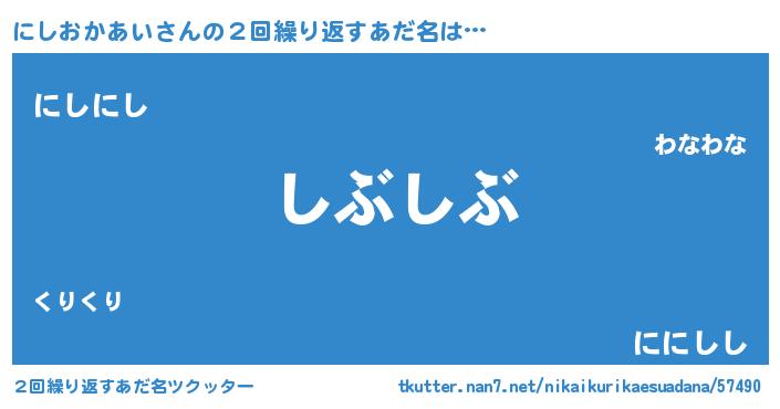 | 女子向けラノベタイトル風あだ名 | 『にしおかあいが死なない童話 林檎のにしおかあいの診療簿』 |