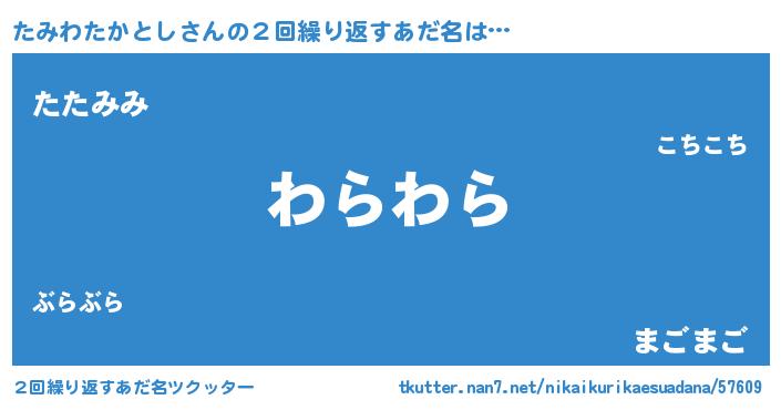 | 男性向けラノベタイトル風あだ名 | 『たみわたかとし~年齢イコール彼女いない歴の魔法使い~』 |