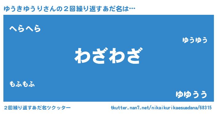 | 男性向けラノベタイトル風あだ名 | 『ゆうきゆうり~年齢イコール彼女いない歴の魔法使い~』 |