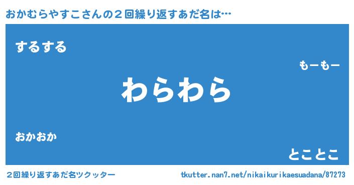 | 男性向けラノベタイトル風あだ名 | 『おかむらやすこ~年齢イコール彼女いない歴の魔法使い~』 |