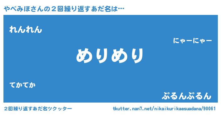 | 男性向けラノベタイトル風あだ名 | 『Re:やべみほから始める異世界生活』 |