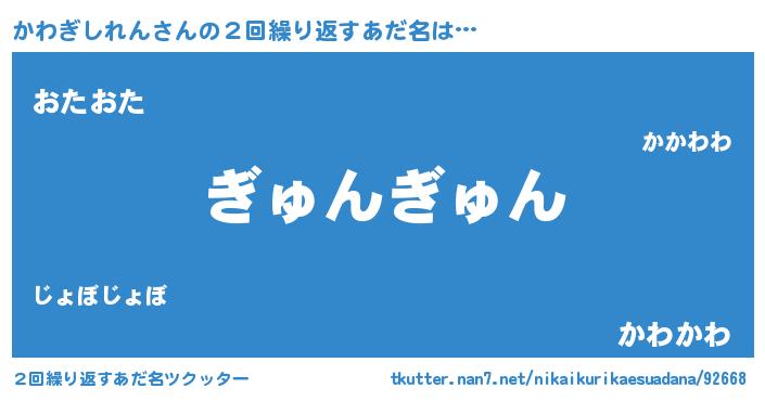 | 男性向けラノベタイトル風あだ名 | 『かわぎしれんという概念が存在しない退屈な世界 』 |