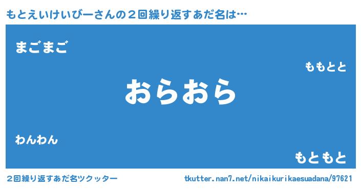 | 女子向けラノベタイトル風あだ名 | 『もとえいけいびーの卵を拾いまして』 |