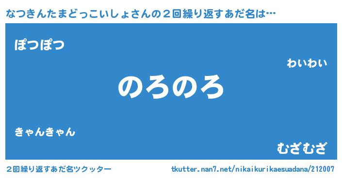 | 男性向けラノベタイトル風あだ名 | 『なつきんたまどっこいしょの嫁は女の子じゃないと思った?』 |