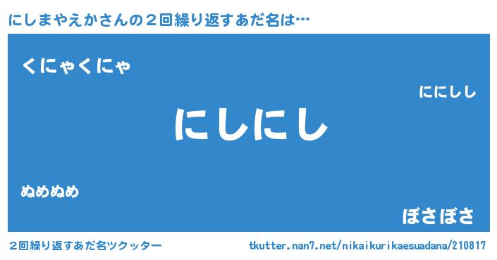 | ヘコむあだ名 | 『にしっふぃ~』『にしまやえか(笑)』 |