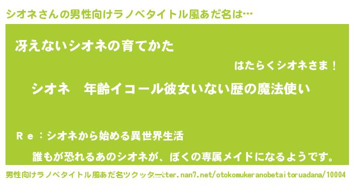 | 女子向けラノベタイトル風あだ名 | 『シオネの玉の輿計画!』 |