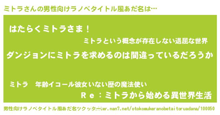 | 女子向けラノベタイトル風あだ名 | 『ミトラの卵を拾いまして』『闇のミトラ』 |