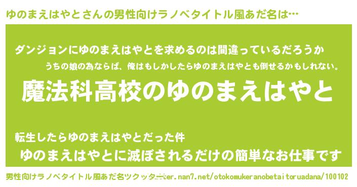 | 女子向けラノベタイトル風あだ名 | 『ゆのまえはやとなんてお断りですっ。』 |