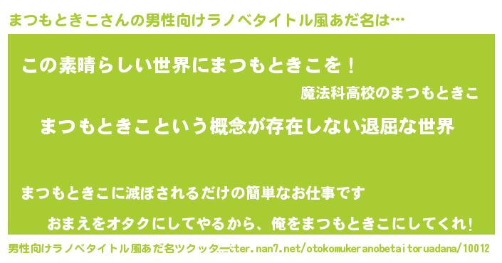 | 女子向けラノベタイトル風あだ名 | 『異世界で失敗しない100のまつもときこ』 |