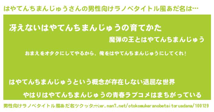 | 女子向けラノベタイトル風あだ名 | 『はやてんちまんじゅう夫妻のなれそめ』 |