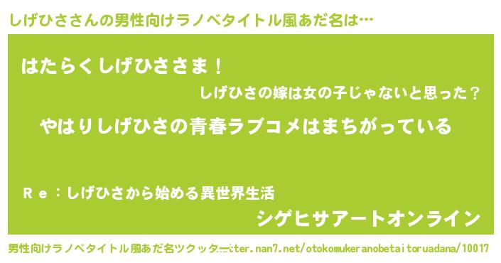 | 女子向けラノベタイトル風あだ名 | 『しげひさ伯爵の花嫁』『闇のしげひさ』 |