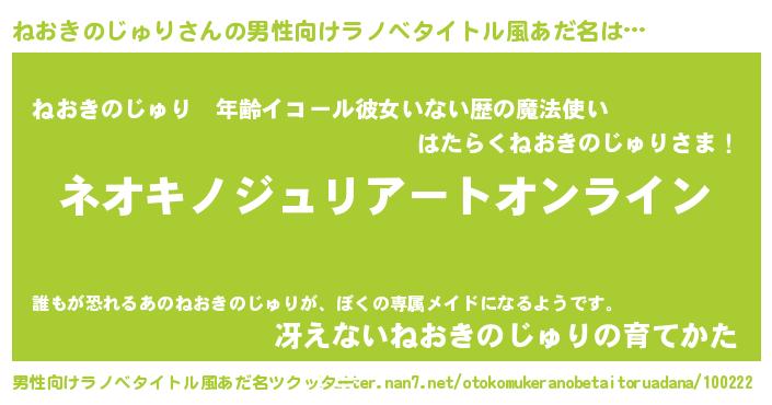 | 女子向けラノベタイトル風あだ名 | 『ねおきのじゅり姫と円卓の騎士』 |