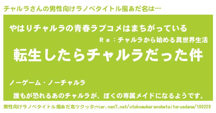 | 女子向けラノベタイトル風あだ名 | 『チャルラの玉の輿計画!』 |