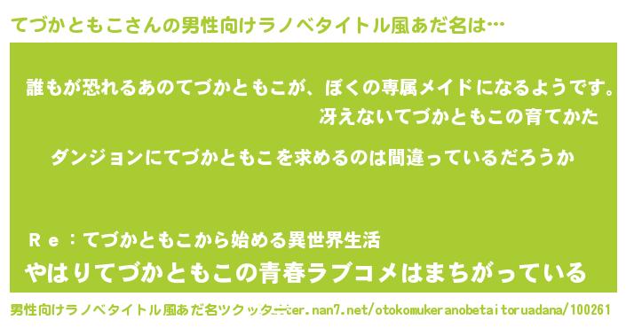 | 女子向けラノベタイトル風あだ名 | 『てづかともこの卵を拾いまして』 |