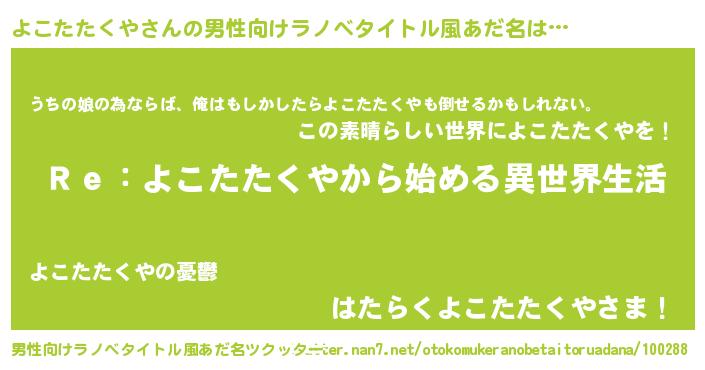 | 女子向けラノベタイトル風あだ名 | 『闇のよこたたくや』 |