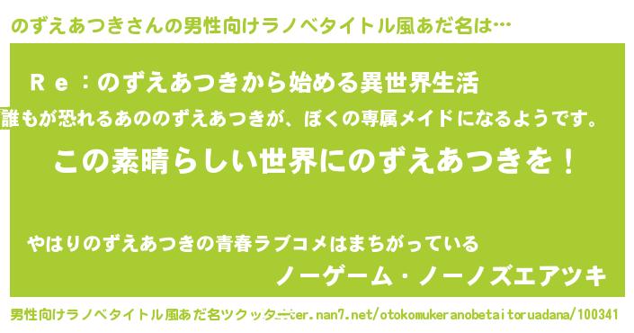 | 女子向けラノベタイトル風あだ名 | 『乙女ゲームの破滅フラグしかない悪役のずえあつきに転生してしまった…』 |