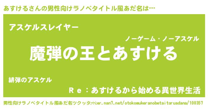 | 女子向けラノベタイトル風あだ名 | 『乙女ゲームの破滅フラグしかない悪役あすけるに転生してしまった…』 |