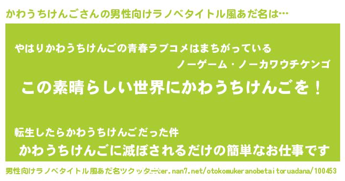 | 女子向けラノベタイトル風あだ名 | 『悪役かわうちけんごに転生したようですが、知った事ではありません』 |