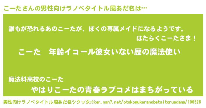 | 女子向けラノベタイトル風あだ名 | 『こーたの玉の輿計画!』 |