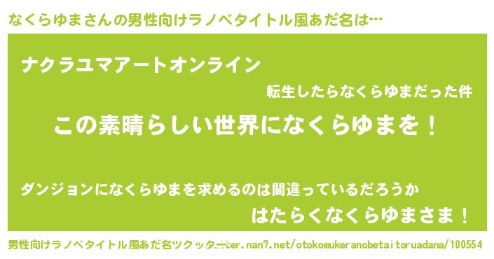 | 胡散臭い通販商品みたいなあだ名 | 『あなたにだけ特別に提供する限定10本のレアな日本酒…その名も「なくらゆま」』 |