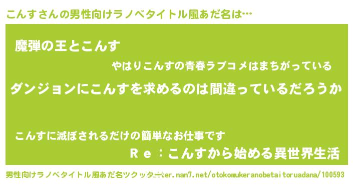 | 女子向けラノベタイトル風あだ名 | 『こんすの卵を拾いまして』 |