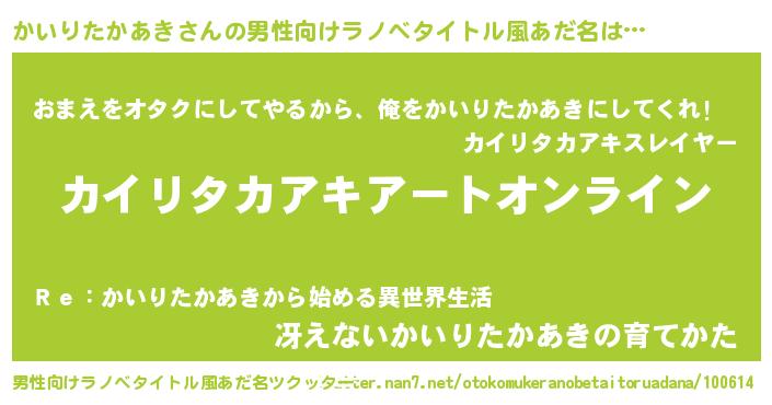 | 胡散臭い通販商品みたいなあだ名 | 『億万長者になれるブレスレット…その名も「かいりたかあき」』 |