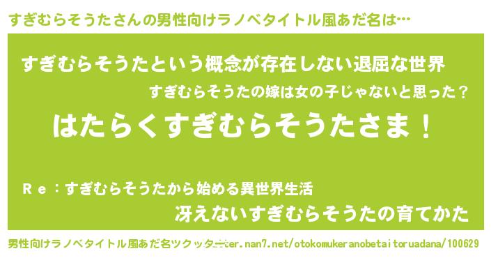 | 胡散臭い通販商品みたいなあだ名 | 『来世でも幸せになれる水素水…その名も「すぎむらそうた」』 |